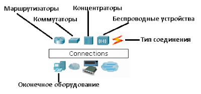 При наведении на каждое из устройств, в прямоугольнике, находящемся в центре между ними будет отображаться его тип. Типы устройств, наиболее часто используемые в лабораторных работах Packet Tracer, представлены на рисунке 7.